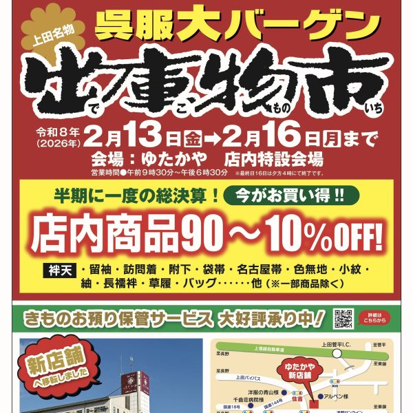 【出庫物市】開催のお知らせ!!日時:2/13(金)~16(月) 9:30~18:30 最終日16時まで場所:ゆたかや特設会場(住吉54-1 上田インタービル)・店内商品90%~10%OFF(一部商品除く)!!・お手入れ相談&丸洗い他20%OFF&きものドクター来場(14日.15日)!!・おしゃれ着物…