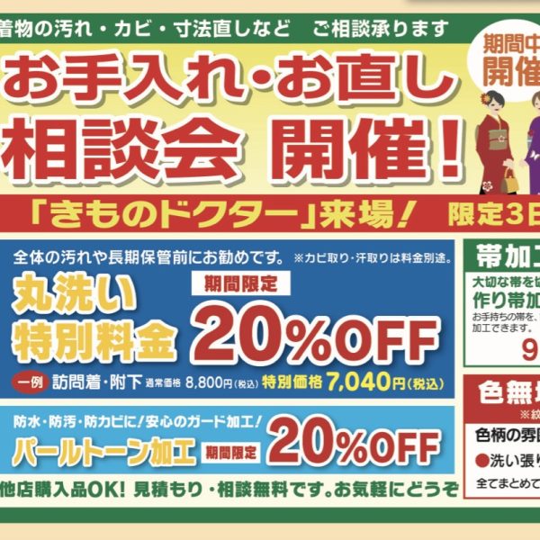 着物お手入れ・お直し相談会開催!!☆着物ドクター来場!14日(土)~16日(日) お手入れ無料相談会開催!☆丸洗い・パールトン加工20%OFF!☆色無地の染め替え¥58,300(税込)!☆作り帯加工&羽織→名古屋帯にリメイク!2月恒例『出庫物市』同時開催!!日時:2/13(金)~16(月) 9:30…